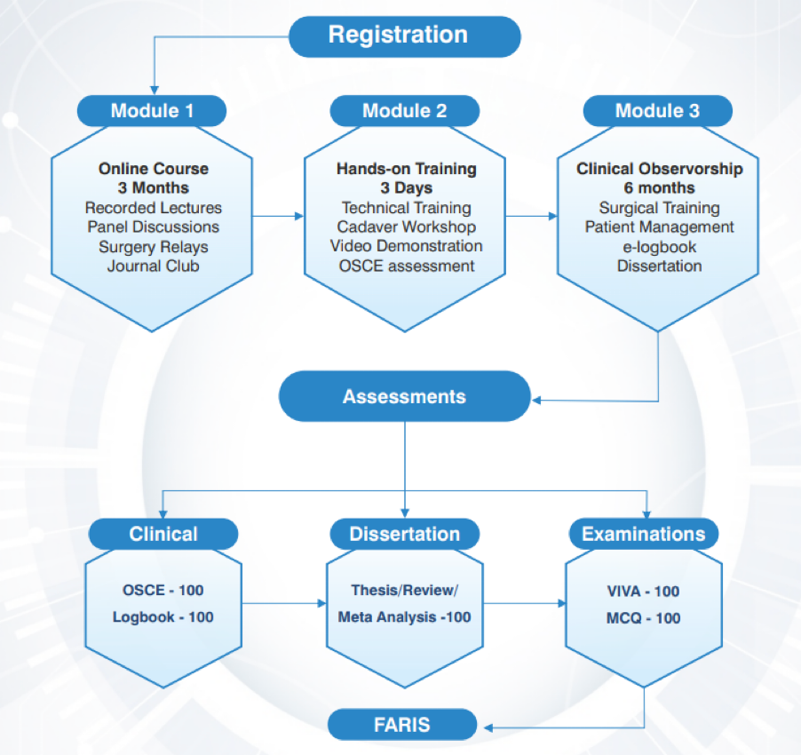 The Scientific committee formulates the syllabus and curriculum. All those members and non- members including international surgeons who fulfil the guidelines and criteria laid down by the committee will be eligible to apply for the fellowship program. However, the candidate has to complete the ARIS membership formalities before applying for FARIS.